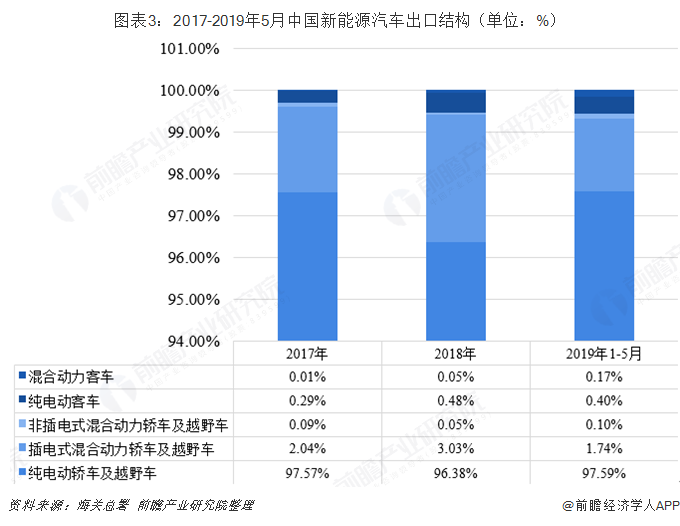从新能源汽车出口结构情况来看,目前我国新能源汽车出口主要以纯电动轿车及越野车(即纯电动乘用车)为主,其次是插电式混合动力轿车及越野车(即插电式混合动力乘用车)。