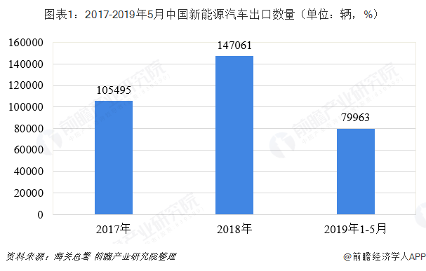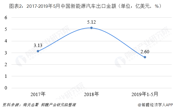 据中国海关统计,我国新能源汽车出口规模表现优异。2018年全年出口新能源汽车14.71万辆,同比增长39.4%;在出口金额方面,2018年我国新能源汽车出口金额为5.12亿美元,同比增长63.58%。截至2019年5月,我国新能源汽车出口累计达到7.99万辆,出口金额合计2.6亿美元。
