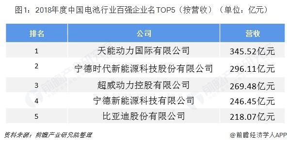按照此次榜单公布的数据,前五名分别是,天能动力国际有限公司,以345.52亿元再次蝉联中国电池行业百强企业第一位,销售收入同比增长28.4%;宁德时代新能源科技股份有限公司,以296.11亿元位居第二位,同比增长48.1%;超威动力控股有限公司以269.48亿元排名第三位,同比增长9.3%;宁德新能源科技有限公司,以246.45亿元位居第四位,同比增长32.7%;比亚迪股份有限公司,以218.07亿元位居第五位,同比增长45.5%。