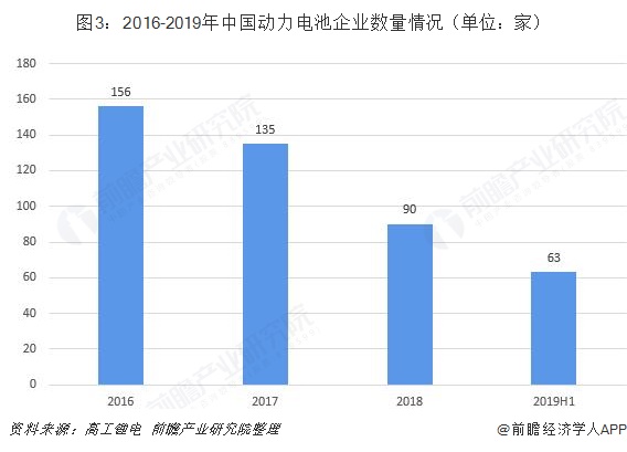 据高工锂电数据显示,中国与新能源汽车配套的动力电池企业已从2016年的155家降到了2018年底的90家,42%的企业已经被淘汰出局。2019年上半年数量降到63家,下半年动力电池企业数量将进一步减少。
