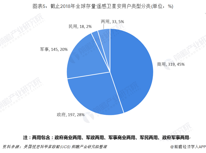 直到近年来众多的初创企业纷纷提出建立各种类型的遥感卫星星座,商业用户逐步成为推动卫星制造发展的一支重要力量,截至2018年11月,商用遥感卫星数量达319颗,占50%,其次为政府用途,数量为197颗,占比28%;第三位为君实用途,数量为145颗,占比20%;第四位为民用,数量为18颗,占比2%;剩余的为两用卫星,占比5%。