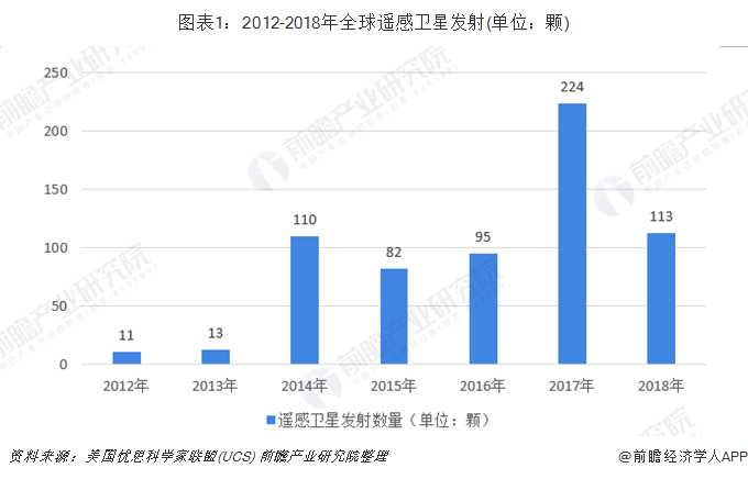 2015年全球发射遥感卫星82颗,中国发射11颗,中国发射遥感卫星占全球的13.4%。2016年全球共有95颗遥感卫星通过31次发射进入太空。根据美国忧思科学家联盟(UCS)发布数据,2017年全球遥感卫星发射数量为224颗,较2016年大幅增长。2017年中国遥感卫星发射数量为19颗。截止到2018年11月份已经达到113次。