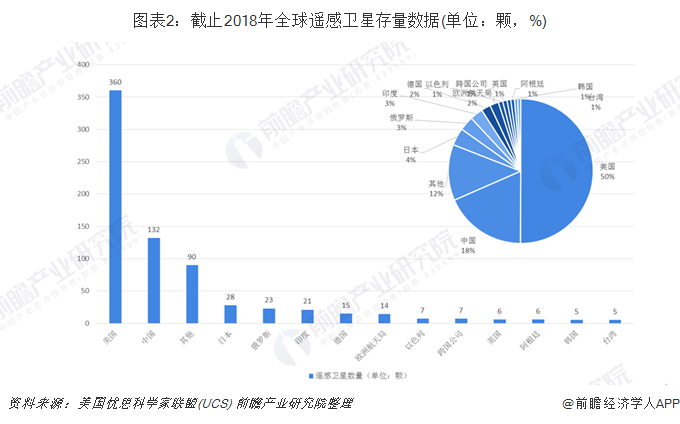 从各国拥有卫星数量角度来看,截止到2018年,美国拥有的遥感卫星数量排名第一,数量为360颗,占比为50%,其次为中国,拥有遥感卫星132颗,占18%;第三为日本,数量为28,占比为4%。其他的俄罗斯、印度、德国等数量都是相对较少。