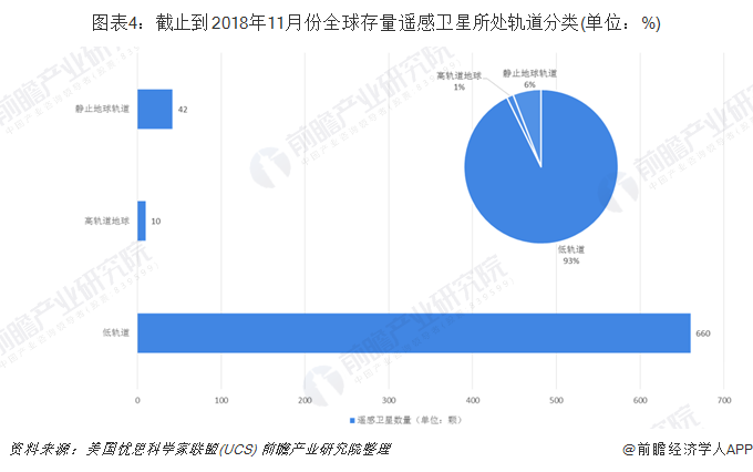 从2018年11月份全球存量遥感卫星所处轨道分类来看,低轨道占据了主要部分为660颗,占比93%,其次为静止地球轨道,数量为42颗,占比6%;其他剩余的为高轨道卫星,占比只有1%。