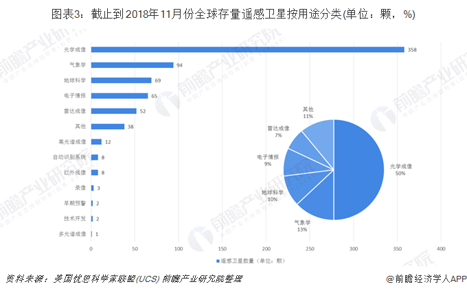 截至2018年11月底,在遥感卫星各用途方面,各类遥感卫星来看,光学成像卫星为358颗,占遥感卫星总量的50%;其次为气象学,存量卫星数量为94颗,占比13%;第三位为地球科学,占比为10;其他电子情报,雷达成像的占比都相对较少。
