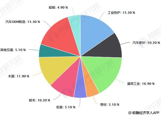 全球工业涂料产品可以细分为:船舶、工业防护、汽车修补、通用工业、卷材、包装、粉末、木器、其他交通、汽车OEM制造。根据美国涂料工业协会的数据,2018年,全球通用工业涂料占工业涂料市场规模的比重最大,为16.9%;其次为工业防护涂料和汽车OEM制造,比重为15.3%。