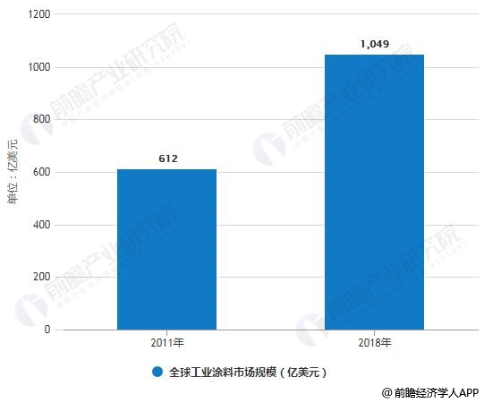 2011年,全球工业涂料市场规模约为612亿美元;2018年全球工业涂料市场规模约1049亿美元;2011-2018年,年均复合增长率为8%。