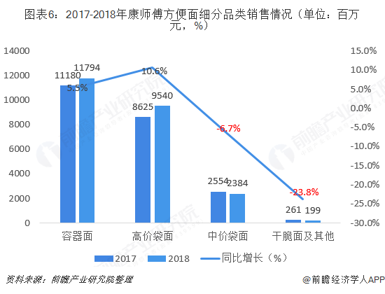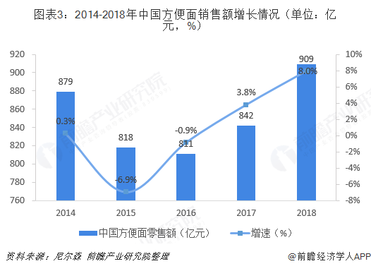 与方便面销量变化趋势相同,方便面的零售额也在持续回升。根据尼尔森数据显示,2018年整体方便面市场销量同比成长3.2%,销额同比成长8.0%。