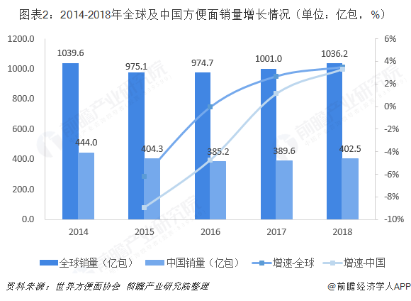 作为世界第一大方便面市场,中国的方便面市场未能像其他地区市场稳步前进,自2015年起就有所回落,但近两年已略有回升,市场正在逐步回暖。2014年中国方便面市场销售量为444亿份,2015年开始逐步下跌,到2016年时售出385.2亿份,为近5年来销量最低。2018年开始,中国方便面市场销量有明显回升,2019年中国方便面销量有望回升到2014年的水平。