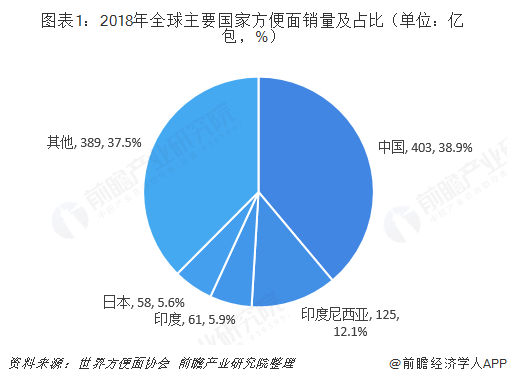 全球方便面市场容量大,中国是最大市场。根据世界方便面协会数据显示,2018年全世界方便面销量达到1036亿份,中国市场占了403亿份,占全球方便面销量的38.9%,排名第一。其次是印度尼西亚,为125亿份;印度方便面需求量为61亿份,排名第三;日本市场需求量为58亿份,位列第四,其余分别为越南、美国、菲律宾等国家。