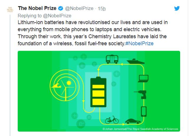 "Lithium-ion batteries have revolutionised our lives since they first entered the market in 1991," the Nobel Foundation said in a statement. "They have laid the foundation of a wireless, fossil fuel-free society, and are of the greatest benefit to humankind."