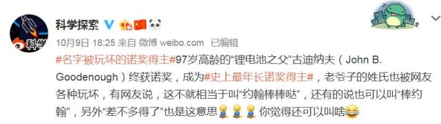 还有网友评论说,John B. Goodenough的名字起得“足够好”,还有人称他为“棒约翰”。