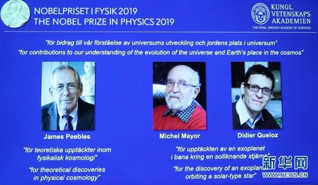 瑞典皇家科学院8日宣布,将2019年诺贝尔物理学奖授予三名科学家。来自美国的詹姆斯·皮布尔斯因宇宙学相关研究获奖,来自瑞士的米歇尔·马约尔和迪迪埃·奎洛兹因首次发现太阳系外行星获奖。