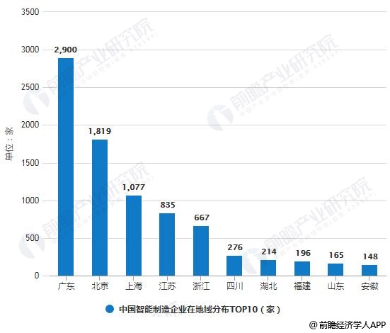 从企业地区分布来看,中国智能制造企业在地域分布方面存在明显差异,普遍分布在一线城市,广东省以绝对优势领跑市场。