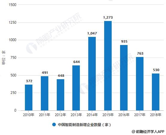 2015年新增企业数量达到顶峰,2016年以后,中国智能制造新增企业数量开始降低,开始纵向拓展和深化智能制造关键技术和应用领域,到2018年,新增企业数量为530家。