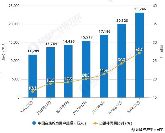 《每日经济新闻》记者注意到,在用户规模方面,前瞻产业研究院报告数据显示,截至2019年6月,我国在线教育用户规模达2.32亿,较2018年底增长3122万,占网民整体的27.20%。手机在线教育用户规模达1.99亿,较2018年底增长530万,占手机网民的23.6%。