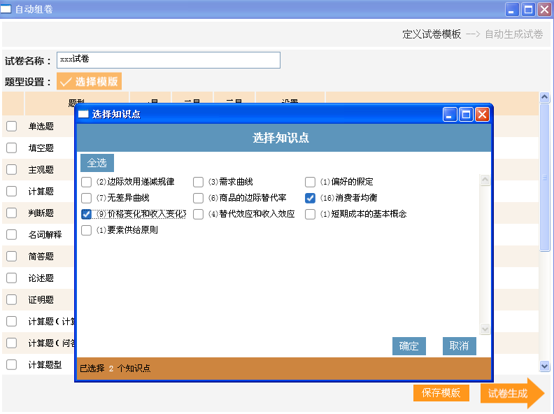 自动组卷:这是试题库软件的核心功能。您可以设定想要考察的知识点、题型与难度,系统根据您的设定自动筛选组卷,您也可以手动组卷:通过对知识点、题型与难度的筛选,手动选择所需试题进行组卷