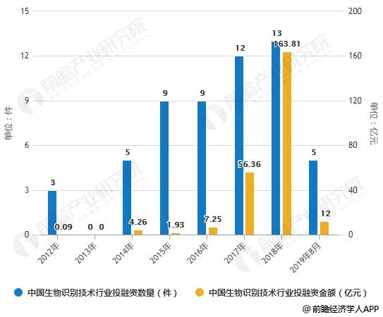 2012-2019年8月中国生物识别技术行业投融资数量、金额统计情况
