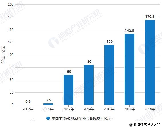 中国生物特征识别市场规模保持高速增长,近几年中国将在信息技术、信息安全、金融交易、社会安全等领域推动生物特征识别标准化工作,产业潜力很大。据前瞻产业研究院发布的《中国生物识别技术行业市场调研与投资预测分析报告》统计数据显示,2002年中国生物识别技术行业市场规模仅有0.8亿元,并呈现逐年高速增长态势,2012年中国生物识别技术行业市场规模达60亿元,到了2016年中国生物识别技术行业市场规模突破百亿元,截止至2018年中国生物识别技术行业市场规模继续增长至170.1亿元。