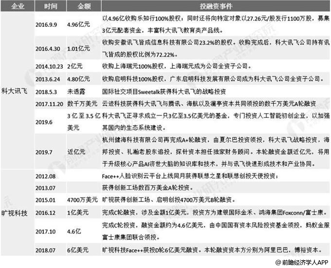 在融资情况方面,目前以科大讯飞、旷视科技为代表的行业领先企业频频获资本青睐。据不完全统计,科大讯飞自2016年起,共计融资轮次达8次,而旷视科技自2012年起共计融资次数达6次,2019年8月,旷视科技去香港申请上市。