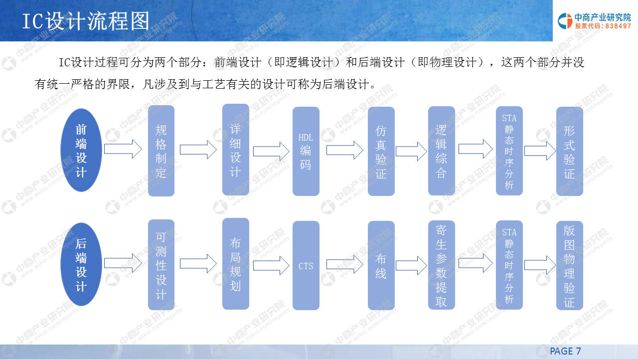 IC设计过程可分为两个部分:前端设计(即逻辑设计)和后端设计(即物理设计),这两个部分并没有统一严格的界限,凡涉及到与工艺有关的设计可称为后端设计。