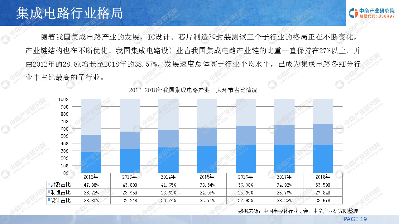 数据显示,2018年我国集成电路产业链中三大环节占比结构比较均衡:其中集成电路设计占比38.57%;制造占比27.84%;封测占比为33.59%