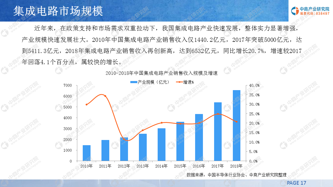 近年来,在政策支持和市场需求双重拉动下,我国集成电路产业快速发展,整体实力显著增强,产业规模快速发展壮大。2010年中国集成电路产业销售收入仅1440.2亿元,2017年突破5000亿元,达到5411.3亿元,2018年集成电路产业销售收入再创新高,达到6532亿元,同比增长20.7%,增速较2017年回落4.1个百分点,属较快的增长