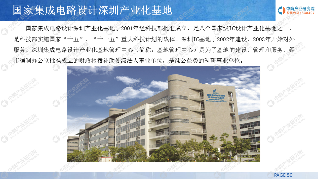 国家集成电路设计深圳产业化基地于2001年经科技部批准成立,是八个国家级IC设计产业化基地之一,是科技部实施国家“十五”、“十一五”重大科技计划的载体。深圳IC基地于2002年建设,2003年开始对外服务。深圳集成电路设计产业化基地管理中心(简称:基地管理中心)是为了基地的建设、管理和服务,经市编制办公室批准成立的财政核拨补助处级法人事业单位,是准公益类的科研事业单位。