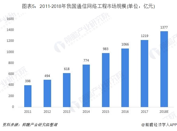 近年我国的电信行业的固定资产投资稳步增长,我国通信网络技术服务市场也处于稳步增长的态势。其中,通信网络工程市场处于稳定增长趋势。2017年,我国通信网络工程市场规模为1219亿元,同比增长14.35%。按照当前我国通信市场的发展速度,前瞻产业研究院测算,2018年我国通信网络工程市场规模在1377亿元左右。