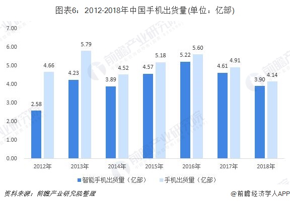 根据工信部数据显示,2012-2018年,受到全球智能手机市场逐步饱和我国经济增速放缓的影响,我国手机出货量呈现先上升后下降的趋势。2016年,我国手机出货量达到5.6亿部,其中智能手机出货量达到5.22亿部,为近年来的最高值,2017年,手机出货量下降,其中智能手机出货量下降11.69%。2018年,我国手机出货量进一步下滑,其中智能手机出货量下降至3.9亿部,同比降低15.40%,但是智能手机出货量仍高于2014年水平。未来随着5G手机开始正式使用,我国智能手机的出货量将会迎来新一轮的增长。