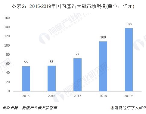 3G-4G是无源天线的时代,天线主要构成部件包括馈线接头、天线振子、移相器、电机、天线罩和反射板等部件,天线材料主要以五金和塑料为主,射频器件主要包括(金属腔体)滤波器、双工器、合路器等。供应商方面,天线厂商主要包括通宇通讯、摩比发展、京信通信和华为,射频厂商为大富科技、武汉凡谷、春兴精工等。近几年,我国网络的普及程度的提高和手机网民数量的快速增长。至2018年,我国基站天线的市场规模到达109亿元,预计2019年市场规模将达到138亿元。