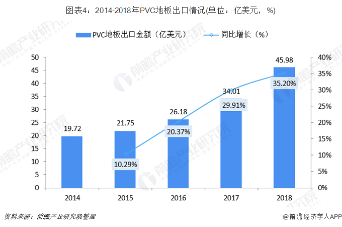 从2014年的139万吨到2018年的354万吨,我国PVC地板在过去5年内出口量增长了1.5倍,年均增速高达27%。出口额从2014年的19.72亿美元增加到2018年度的45.98亿美元,年复合增长率达23.57%,增长速度较快。未来伴随着中国PVC地板领域企业在技术及生产工艺上取得进展和突破,中国PVC地板出口需求将进一步得到刺激。