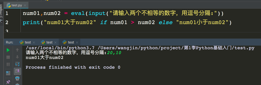 代码分析:首先使用的eval函数来输入两个不相等的数字,eval 只能一次输入多个数字(其实是字符串),eval把输入的数字自动转换为int类型;然后判断num01是否大于num02,如果大于,判断的结果为True就返回"num01大于num02",如果num01小于num02,判断结果为False就返回"num01小于num02"