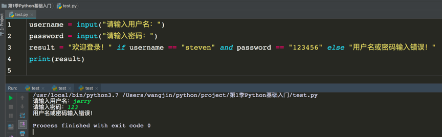 result ="欢迎登录!"ifusername=="steven"andpassword=="123456"else"用户名或密码输入错误!"