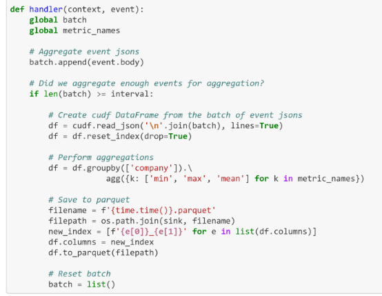 结合使用Nuclio与RAPIDS,基于Python流处理获得GPU加速,最终实现完美蜕变。以下代码与批处理案例别无二异,本文只是将其置于一个函数处理程序中,并将传入的消息收集到更大的批中以减少GPU调用。