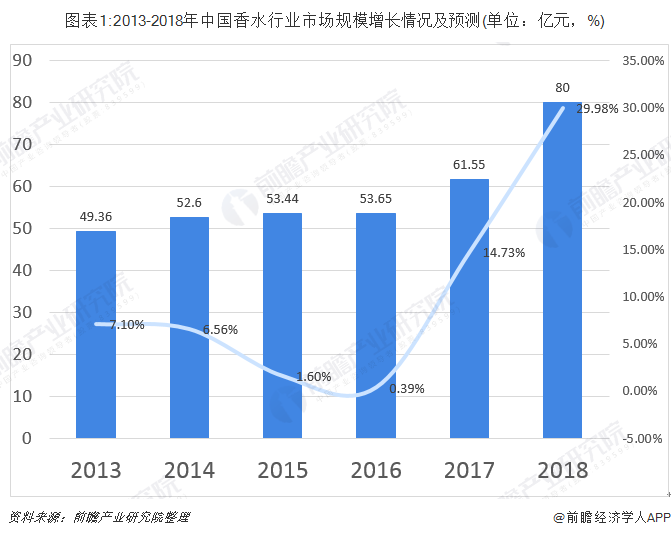 2018年,中国香水行业市场规模增长至80亿元,同比增长29.98%。