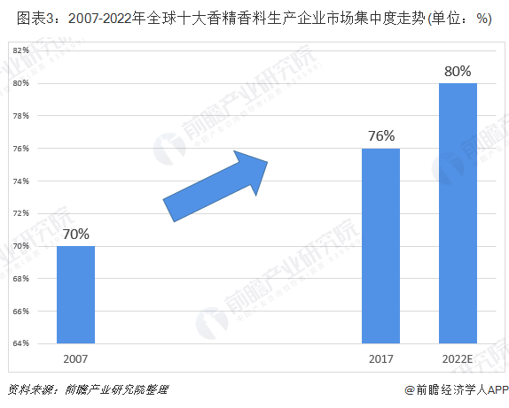 自20世纪90年代以来,香水行业集中度进程明显加快,核心生产企业日趋稳固,前十大生产企业所占的市场份额不断提升。2012-2017年,全球十大香精香料生产企业市场集中度走势逐渐上升。2017年前十大生产企业合计销售额所占比重达76%左右,预计未来几年香水行业CR10将突破80%。