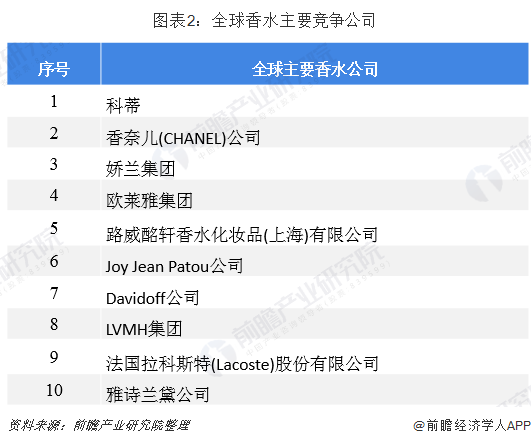 从香水品牌的竞争格局来看,占据全球香水市场份额的公司主要是科蒂、香奈儿、娇兰集团、欧莱雅集团、路威酩轩香水化妆品(上海)有限公司、Joy Jean Patou公司、LVMH集团、Davidoff公司、法国拉科斯特(Lacoste)股份有限公司、雅诗兰黛公司等。其中,科蒂公司为市场巨头。