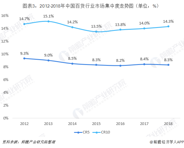 由于国内百货零售行业向现代化经营模式转变的时间尚短,在全国范围内尚未形成具有较高市场地位的垄断性百货零售企业,行业整体市场集中度仍然处于较低的水平。中国百货商业协会的统计数据显示,百货行业的集中度略高于超市行业,但CR10基本保持稳定,CR5出现轻微下滑趋势,2018年分别为14.3%和8.3%,市占率最高的王府井占比为2.5%。