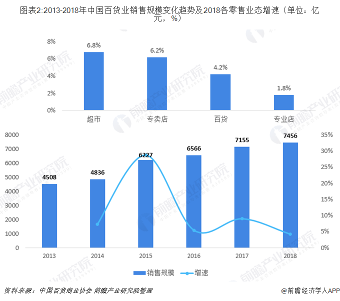 中国百货商业协会发布的《2018-2019年中国百货零售业的发展报告》显示,2018年限额以上零售业单位中,超市、百货、专业店和专卖店四个业态增幅分别为6.8%、3.2%、6.2%、1.8%,我国百货业增长持续趋缓。另外据中国百货商业协会调查数据,中国90家百货行业骨干企业2018年销售额为7456亿元,较2017年仅增长4.2%,增速创2014年以来新低。