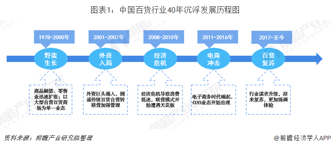 中国百货行业自1978年商品解禁以来,行业自身的发展大致历经了40年发展沉浮,可以分为5个阶段: