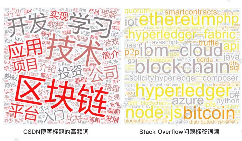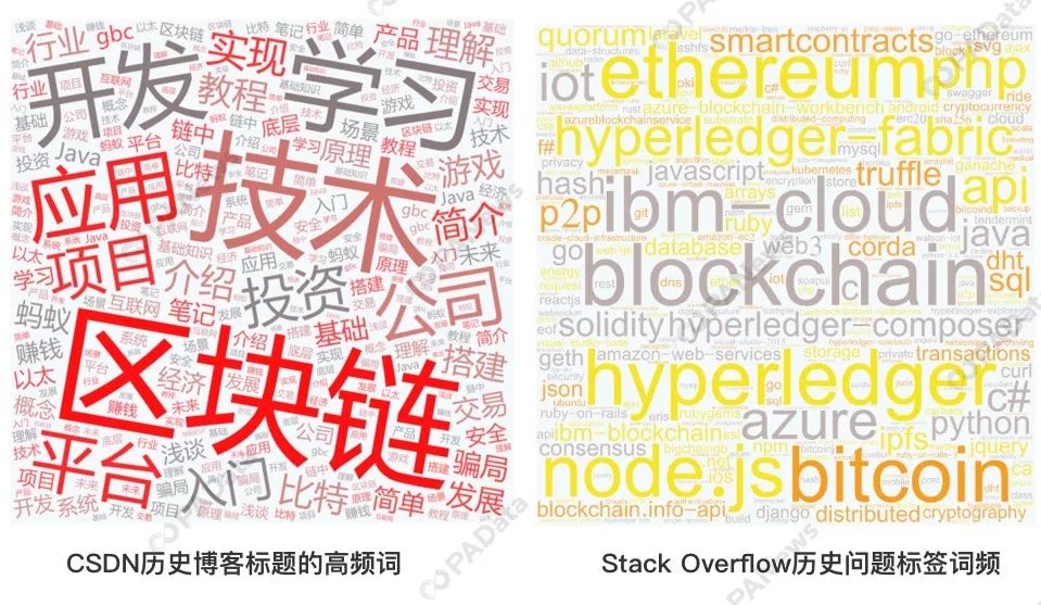 PAData分析了国外最大的技术社区Stack Overflow和国内最大的技术社区CSDN中关于区块链的内容,以CSDN以关键词“区块链”搜索得到的300篇博客标题和Stack Overflow以关键词”blockchain”搜索得到的500条问题的全部标签为分析对象,经过词频统计后可以发现除了搜索关键词以外,诸如“技术”、“开发”、“学习”、“应用”、“教程”、“入门”、“node.js”、“azure”、“hyperledger-fabric”、“ethereum”都是出现频次很高的词,这也印证了技术社区的这一共性。