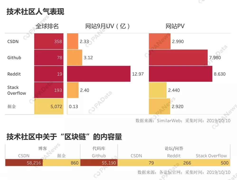 PAData选取了5个知名的技术社区,分别是Github、Reddit、Stack Overflow、CSDN、掘金,通过内容数量和网站流量来观察这些社区的活跃度,理论上网站总流量越大,分流到区块链板块的流量也会越大,这个技术社区就越活跃。