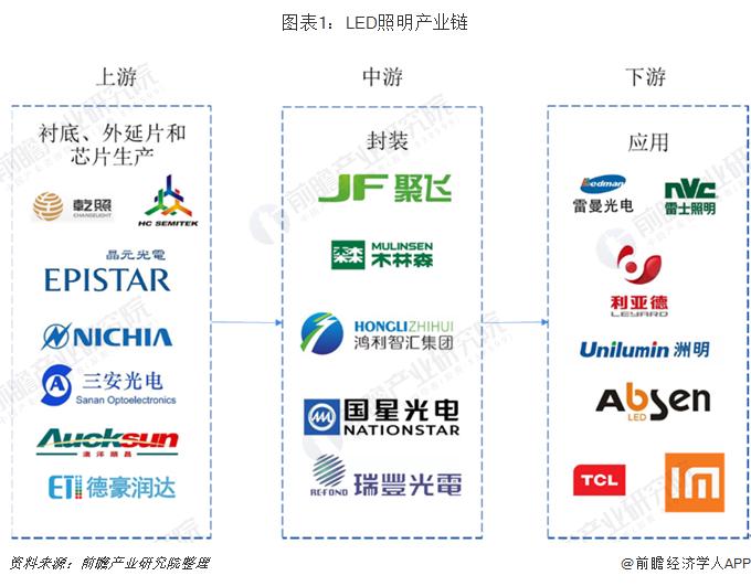 LED照明产业按照其制造过程,大体上可以分为衬底、外延片、芯片、封装和应用五个环节。其中衬底、外延片和芯片统称为产业链上游,封装为中游,应用为下游。