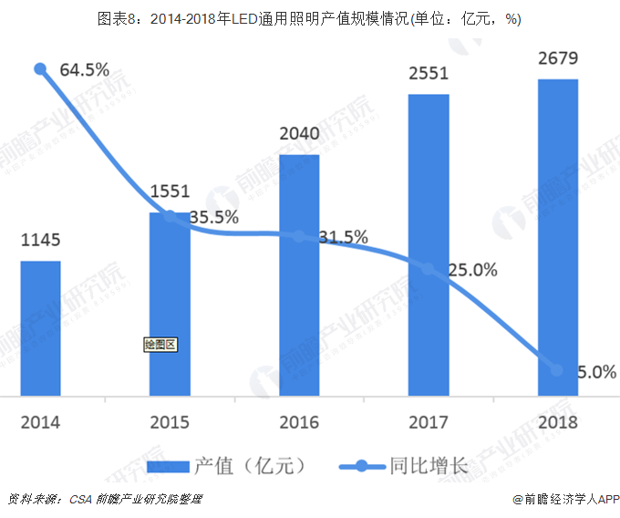 受益于LED渗透率的快速提高,近年来通用照明占比下游应用市场比例不断提高,从2010年的21%提升至2018年的44.06%,最高时2017年占比达到47.8%。据CSA统计数据显示,2014-2018年,我国LED通用照明产值规模持续提升,2018年达到2679亿元,同比增长5.0%。