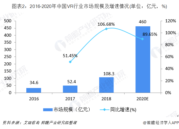 数据显示,我国VR行业从2016年开始发展起来,市场规模迅速增长。2016年,VR行业规模仅为34.6亿元,至2018年已经突破百亿大关达到108.3亿元。未来五年中,我国VR市场将保持高速增长,年复合增长率将超过80%。预计到达2020年,中国将成为全球数一数二的VR,行业规模将超过450亿元。