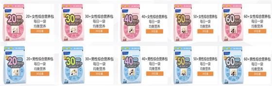 在中老年女性方面,40+主打明眸抗氧、解压抗疲、预防血栓;50+主打美白抗氧、预防血栓、增强记忆;60+主打滋养关节、提升精力、增强记忆;
