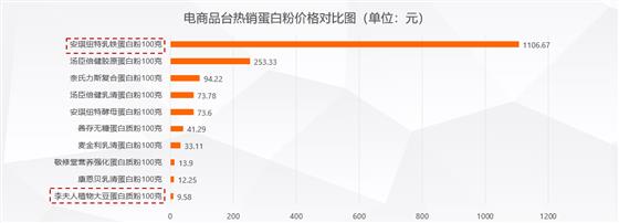 伴随着产品升级的是价格的大幅提高,我们将电商平台热销蛋白粉进行了价格对比,以100克为单位衡量,跨界品牌安琪纽特乳铁蛋白粉的价格为1107元,是广州白云山药业旗下子品牌李夫人价格的一百多倍,显现出产品升级带来的巨大商业价值。