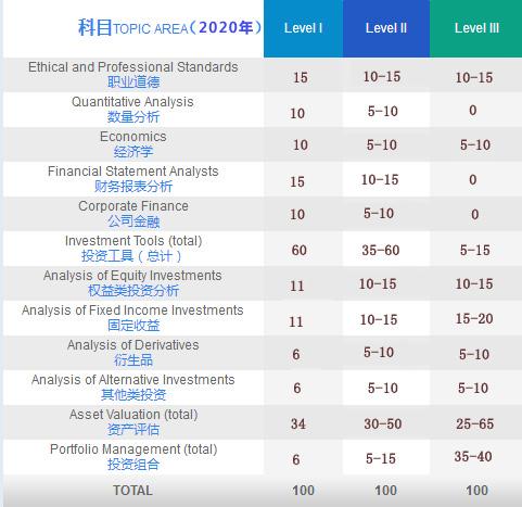 职业伦理道德10%-15%、定量分析5%-10%、经济学5%-10%、财务报表分析10%-15%、公司理财5%-10%、权益投资10%-15%、固定权益投资10%-15%、衍生品投资5%-10%、其他投资5%-10%、投资组合管理5%-15%