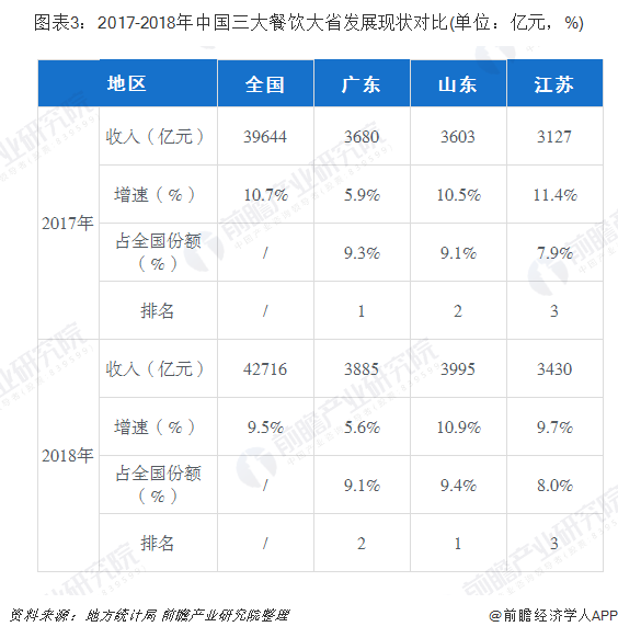 2017年,虽然全国已有三个省份跨入3000亿元阵营,广东勉强保持了餐饮收入第一的宝座;然而到了2018年,山东餐饮增速同比提升了0.4个百分点,广东相比山东餐饮增速差额出现了进一步扩大,达到前所未有的5.3个百分点,导致广东餐饮业历史上首次不保第一大省的称号。